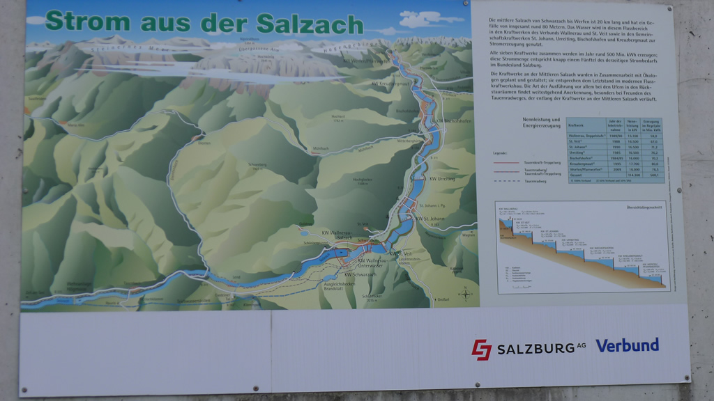 This is now the Salzach river and the Salzach valley. As this board at the dam power station illustrates, it is very heavily damned river. The dams have the effect of turing the river into a line of very long lakes.