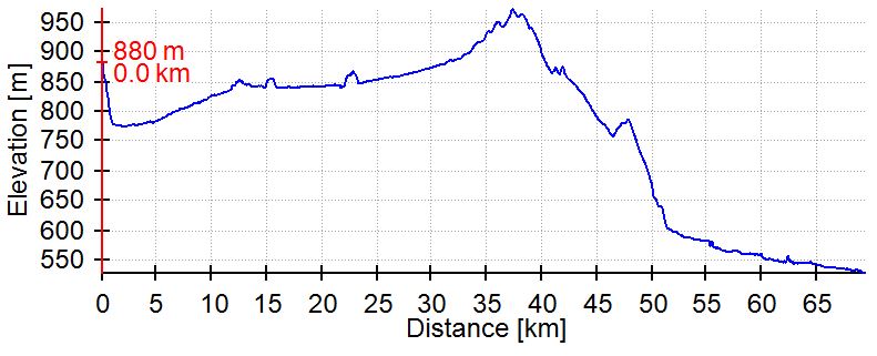 The profile for the 4th day from Schladming to Werfengweg. The inital 100m steep plummet from our Alpine accommodation is clearly visible as is a clean 200m drop into the Salzach valley.