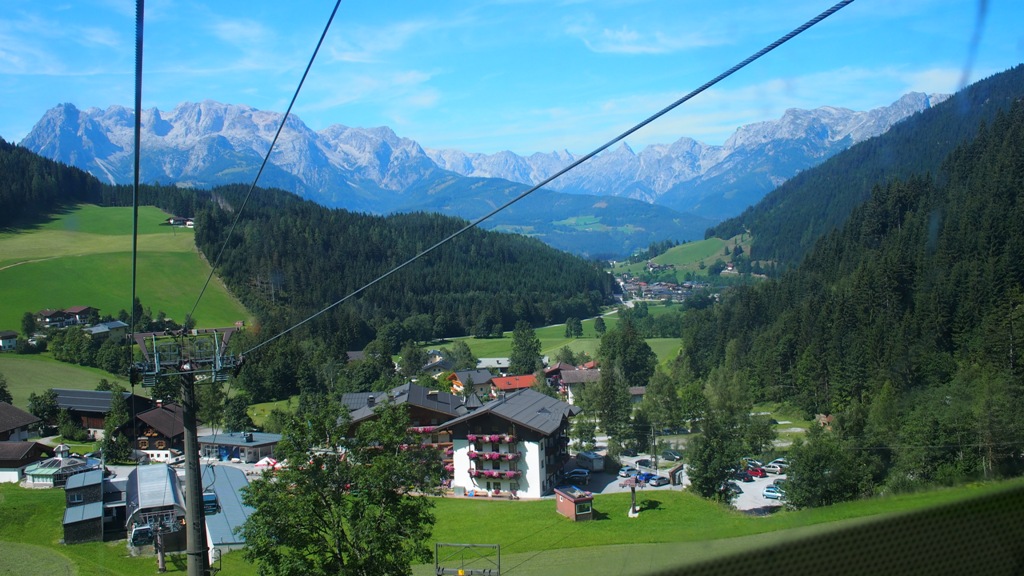 We caught the train up the Salzach River valley to Pfarrwerfen Station and then rode the 6.6 km to the bottom of the cablecar going up the Bischling from Werfenweng. This ride is mostly up, nearly 400 vertical metres in the triple chainring.