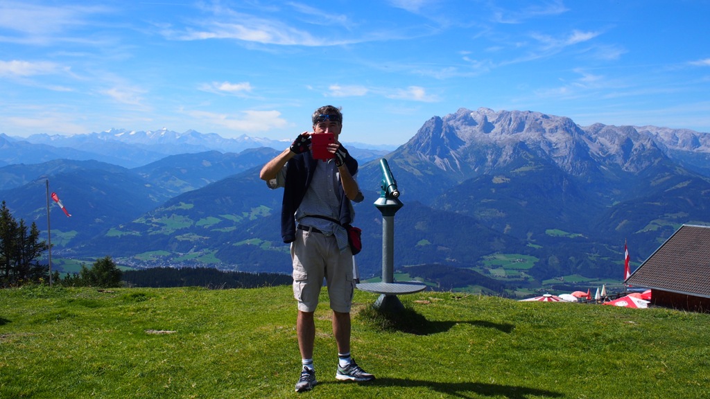 It is very clear at the top and we can Glossglockner, the highest peak in Austria, to the left of Richard. Thus Hochkonig, on his right, seems so much lower now.