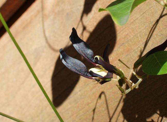 A black creeper on the shed wall, above, and below, pink cow bells of a Giant Flowered Guichenotia (Guichenotia macrantha)