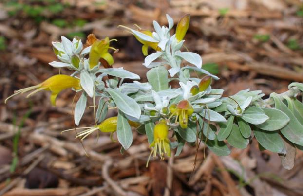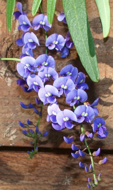 A pink ground grevillea, above and a blue native creeper, right. |
