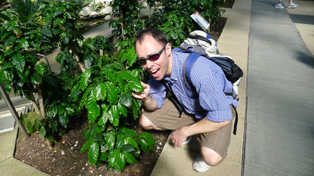 Orchards, lots of orchards. Andrew and cocoa plant. These tropical lizards run free around the glasshouse and are actually breeding. Somewhere in one of the big, old Victorian era glasshouses. Huge pieces of wrough iron everywhere, on the second floor, probably 10m above the deck.