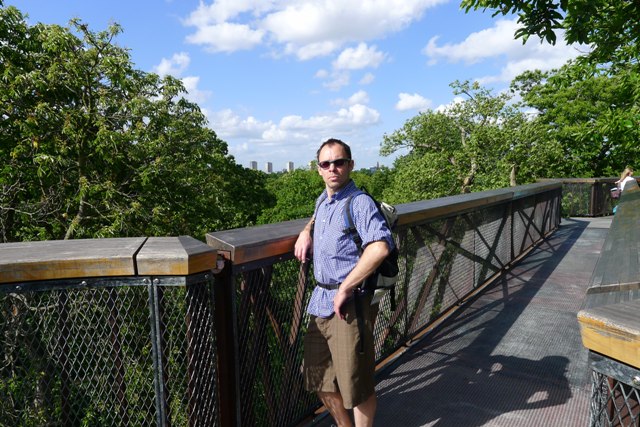 Andrew and the tree top walk with one of the Victorian greenhouses in the background. A view of the walk, showing the simple but artistic design, beautifully structural.
