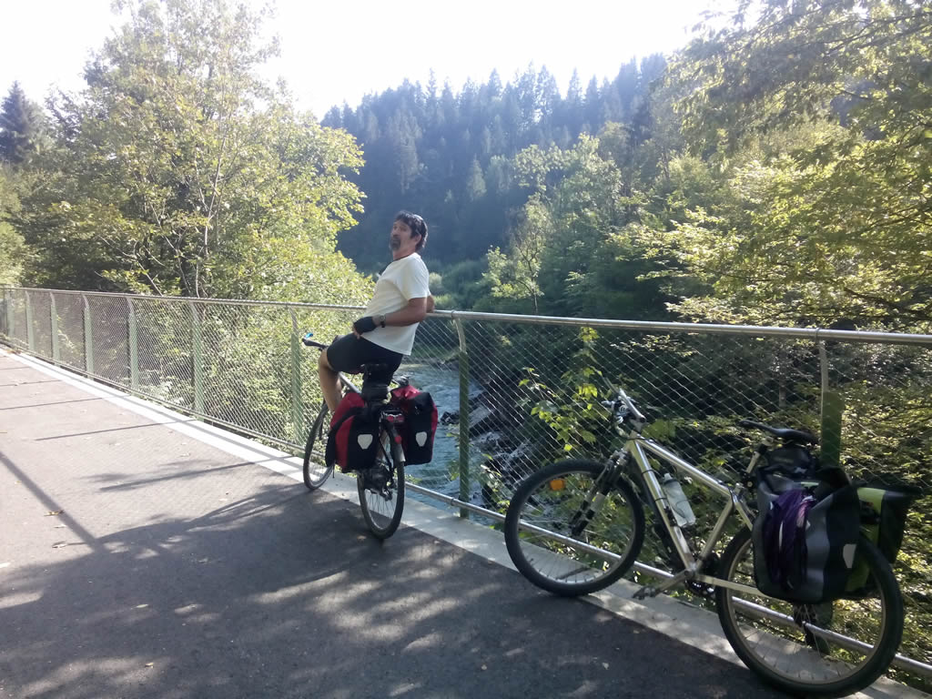 We leave Lunz up a new route and in trying to find it, we end up taking shelter from the rain under a bridge crossing the valley. This is after 15 minutes previously sheltering under somebody's garage roof, a few hundred metres higher up the hill. The rain does not look like it is going to clear, so we remove shoes and put on thongs. Dispite the rain, it is not cold and we already wearing raincoasts.