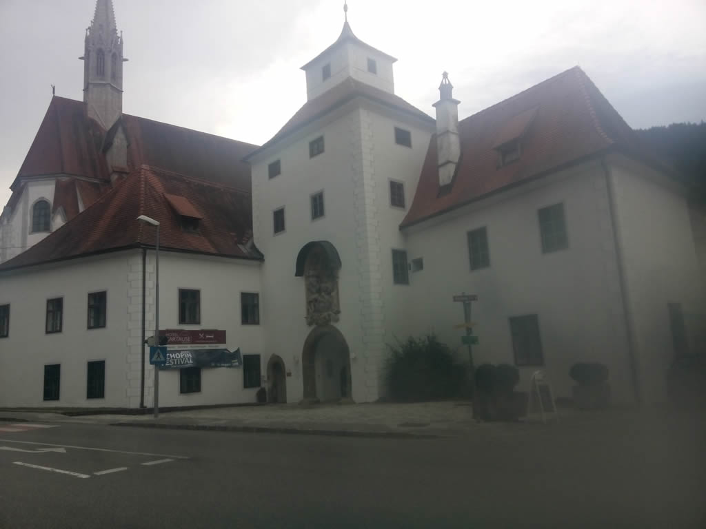 We spend the next 2 hours riding up the valley of the Bodingbach which flows into Lunz, over the pass at the village of Bodingbach and down along Mittaubach river in constant and heavy rain. There is a little traffic and it has almost finished raining by the time we reach Kartause Gaming which is a very large and very old Monastery. We stop for lunch.