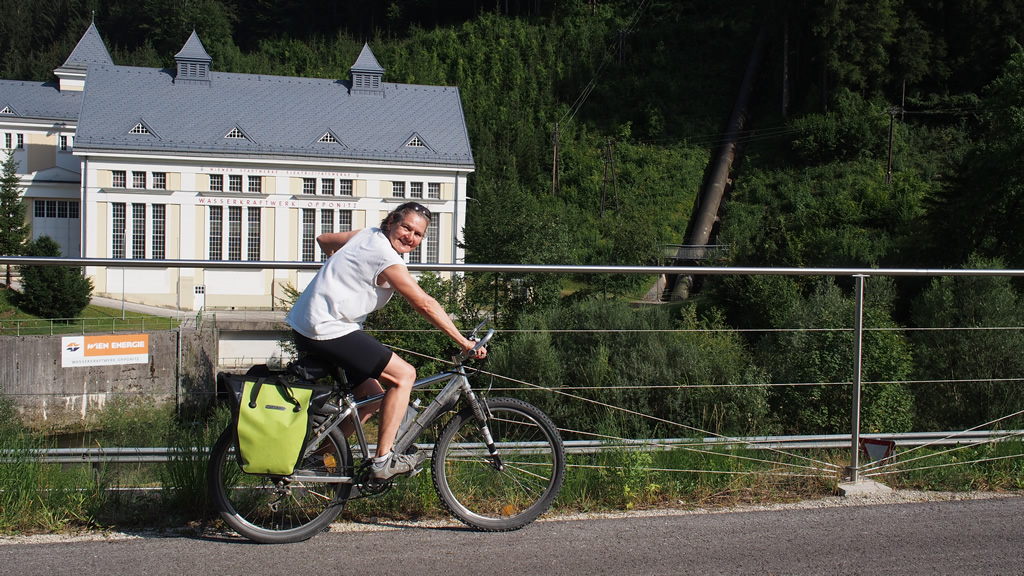 The surface was good enough for roadies out training, but we also passed a number of family groups. Suz stopping in front of a hydroplant, the top of the hill being a good couple of hundred metres above us. We stopped for the night at a village called Hollinstein (an der Ybbs) in a place right beside the road going up the valley. The building was hot so we needed the windows open but it was noisy so . . . After dinner we go for walk into town, this place appears to be mountain bike central . . . though it is just literature we see. There is a beautiful old cemetary surrounding the church below.