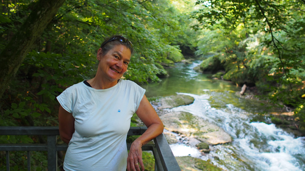 It is quite warm, so we detour down the steep unsealed road to the river to the Ybbsnaturbad Kematen for a swim and a river crossing on an aluminum cable raft thingy. Lots of purple damsel flies.