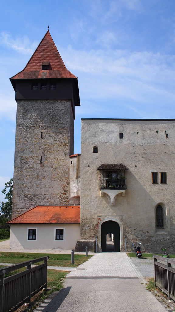 Schloss Ulmerfeld castle at the top of short but steep hill. The tower has a collection of weapons from the ages on display as you walk up the stairs and at the top..