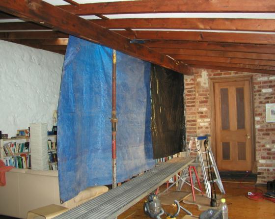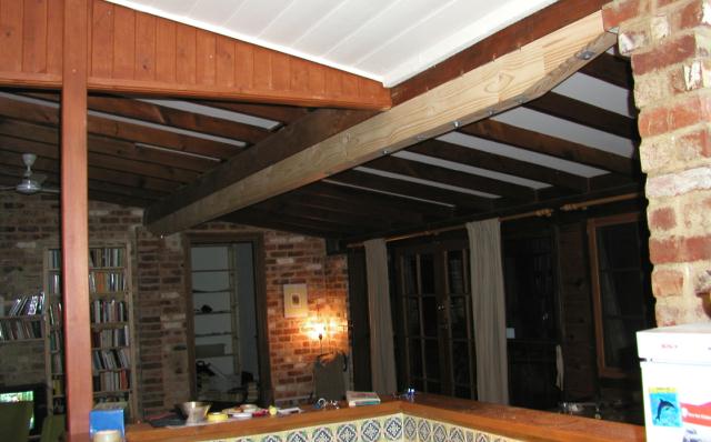 The main beam in the lounge was actually not adequate and much thought went into a suitable solution. Timber was purchased and Peter went to work in his shed. Then on Monday, 8th May, Toc and I and pick up the resulting 6.8m beam with his big red Landrover. Susanna is not in the pictures as she was in China, and I was not in the pictures as I was taking them.