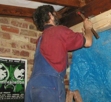 Above, Peter, and below, Toc, both hammering in the homemade (Peter, of course) 'T' bone shaped pieces, designed to resist shear between the top and bottom beams. Used mainly at the ends.