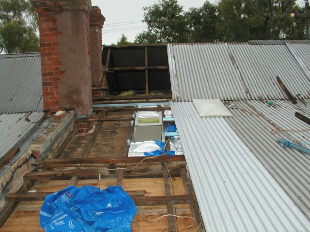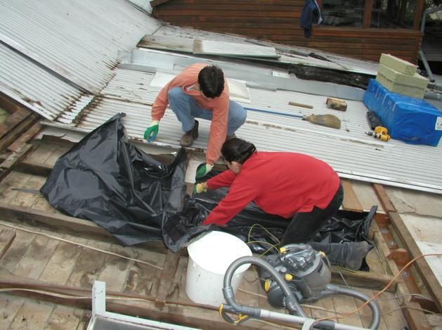With at least four of the pieces of tin removed, Susanna and Andrew put in some plastic as protection against condensation for the rockwool insulation. Note the water marks on the timber ceiling above the white bucket.
