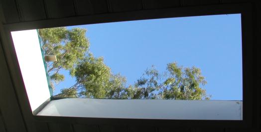 Note the removal of old, rusty tin, a little venting chimney, and protruding skyligh domes. The roof no longer has a split level and the ivy has been cleared from the plastic ventilation pipe (behind Toc). The kitchen roof leaked water during heavy rain and did not have any ceiling insulation. Note, too, the amount of sunlight above - on the day we pulled the tin off it was forecast fine but delivered dizzle - the driest winter on record . . .